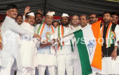 Photo Caption : Newly appointed KPCC President Dinesh Gundu Rao taking charge as the KPCC president in the presence of outgoing President Dr G Parameshwara, Working President Eshwar Khandre, Former CM Siddaramaiah, Minister DK Shivakumar, Congress MLAs, MPs and MLCs at Palace Grounds, in Bengaluru on Wednesday 11th July 2018