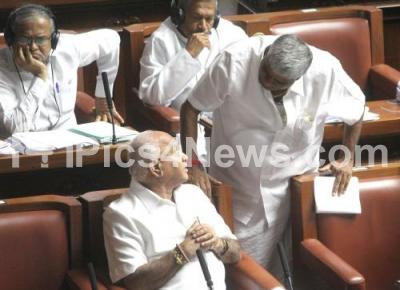 Photo Caption : Minister H D Revanna and Assembly Opposition Leader BS Yeddyurappa seen discussing during Assembly Session at Vidhana Soudha, in Bengaluru on Friday 13th July 2018