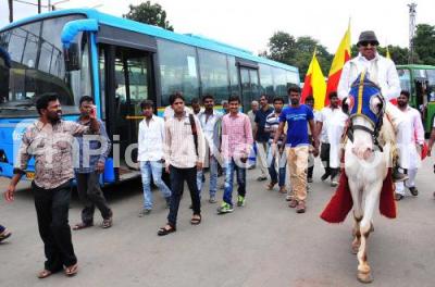 Photo Caption : Members of Kannada Chaluvali Vatal Paksha led by its president Vatal Nagaraj, seen riding a horse at Kempegowda Bus Stand in protest and demanding for free bus passes to the students, in Bengaluru on Friday 13th July 2018