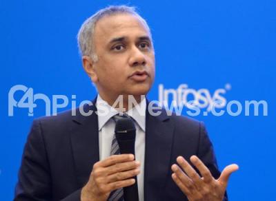 Photo Caption : Salil Parekh, CEO and MD, Infosys addressing at a press conference to announce the Infosys Q1 results at Infosys campus, in Bengaluru on Friday 13th July 2018