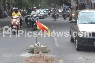 Photo Caption : A deadly pothole being covered with stones and Karnataka flag as a caution sign to motorists at RV Road, in Bengaluru on Saturday 14th July 2018