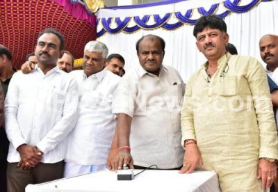 Photo Caption : CM HD Kumarswamy with Ministers DK Shivakumar and HD Revanna inaugurated various development works in Ramanagar on Monday 16th July 2018