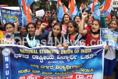 Photo Caption : ABVP members protesting for free bus passes for students at Anand Rao Circle, in Bengaluru on Thursday 19th July 2018