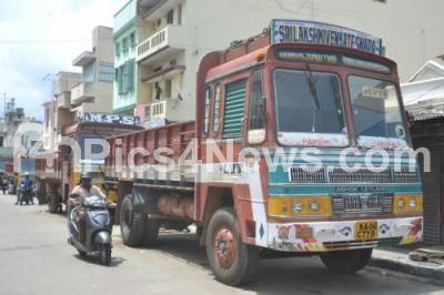 Event Description : Goods being transported by mini vans and tempo at Tharagupet near KR Market, due to ongoing lorry strike, in Bengaluru on Tuesday 24th July 2018