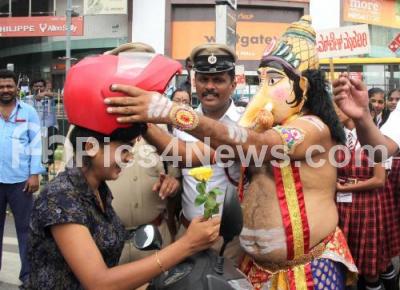 Event Description : Bangalore Traffic Police organised a innovative idea to spread road safety awareness by deploying people dressed like lord Ganesha at Rajkumar Road, as part of road safety awareness campaign, in Bengaluru on Wednesday 25th July 2018