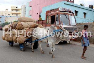Photo Caption : Goods being transported by bullock cart, due to indefinite lorry strike, in Bengaluru on Wednesday 25th July 2018