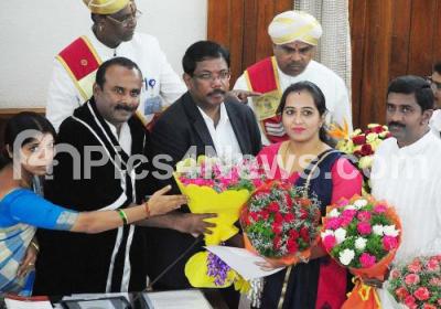 Photo Caption : Newly elected JDS Councilor Ishwarya from Binnypet ward being greeted by Mayor Sampath Raj, Deputy Mayor Padmavathi, BBMP Commissioner Manjunath Prasad and Ruling Party leader M Shivaraj during BBMP council meeting at BBMP, in Bengaluru on Monday 30th July 2018