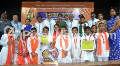 PGR Sindhia with Venugopal, Vice Chancellor Bangalore University and others presented awards to participants of the Geetha Gayana 2018 competition at Bharath Scouts and Guides, in Bengaluru on Tuesday 31st July 2018
