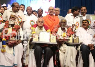 Photo Caption : CM HD Kumarswamy with JDS State President H Vishwanath and others felicitated adiwasi community leaders during the 24th International Day of the Worlds Indigenous people at Ambedkar Bhavan, organised by Karnataka Adiwasi Rakshana Parishath, in Bengaluru on Thursday 9th August 2018
