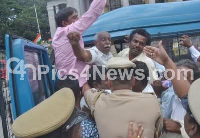 Photo Caption : Members of Karnataka Farmers Association, affiliated to CITU, were taken into preventive custody by police during their protest, demanding to implement Swaminathan Report, the protest was held at Town Hall, in Bengaluru on Thursday 9th August 2018