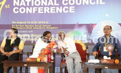 Photo Caption : Sri Sri Ravi Shankar with Former Justice Santhosh Hegde, BV Mallikarjun and others inaugurated the 71st National Council Conference at Art of Living, organised by Indian Federation of Working Journalist, in Bengaluru on Saturday 18th August 2018