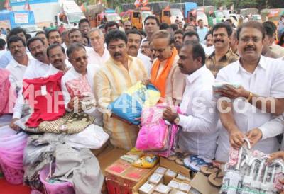 Photo Caption : Union Minister Ananth Kumar with BJP MLAs R Ashok, Sathish Reddy, Uday Garudachar, MLC Lehar Singh and others seen mobilising the flood relief material to be dispatched to flood hit areas of Madikeri and Kerala at National College Grounds, Basavanagudi, in Bengaluru on Tuesday 21st August 2018