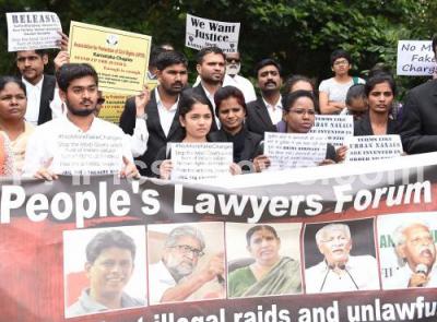 Photo Caption : Members of Peoples Lawyers Forum hold a banner during a protest against the recent raids and alleged unlawful detention of lawyers and right activist by Pune police , in Bengaluru on Friday 31st August 2018