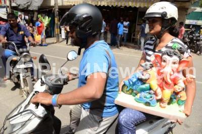 A women carrying Ganesha idol at RV Road on the occasion Ganesha Chaturthi festival, in Bengaluru on Wednesday 12th September 2018