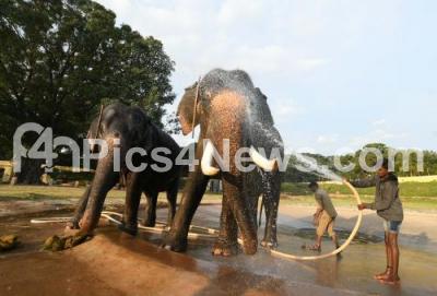 Event Description : Labourers bathing the Dasara Elephants at Mysore Palace for the upcoming Dasara Festival, in Mysuru on Wednesday 12th September 2018
