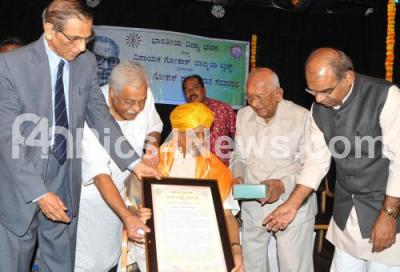 Photo Caption : Kannada Development Authority, President, SG Siddaramaiah presenting "Prof VKru Gokak 2018" award to Prof Dr Sha Shettar at a award presentation program, organised by Vinayaka Gokak Vajmai Trust at Bharatiya Vidya Bhavan, also seen are Vinayaka Gokak Vajmai Trust President , YN Gangadhar Shetty, BVB Secretary, H N Suresh and others, in Bengaluru on Sunday 16th September 2018
