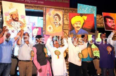 Chitravadani Dr BKS Verma, Artist Baguru Markandaiah, KV Subramanya, Artist B Gujarappa and Parameshwar Gubbi displays Dr Vishnuvardhan paintings during Dr Vishnu Seva Samiti program at Kuvempu Kalakshetra , in Bengaluru on Monday 17th September 2018