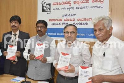 Photo Caption : Karnataka Right to Information Chief Commissioner, L Krishnamurthy with CHRI New Delhi Venkatesh Nayak, Karnataka Right to Information Commissioner, SL Patil, Mumbai Centre Right to Information Commissioner Shailesh Gandhi and Former Minister SK Kanta releasing Karnataka State Public Records Act 2010 and 2013 during a discussion progaramme on “The implementation of the Act of Karnataka Sarva Janaki records is a challengeâ€, in Bengaluru on Sunday 23rd September 2018