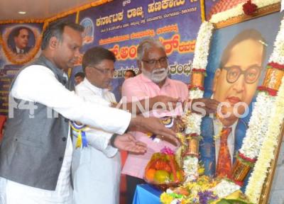 Photo Caption : Ministers Priyank Kharge, N Mahesh with VS Ugrappa and others tribute to Dr BR Ambedkar portrait on his 127th Birth Anniversary program at Jasma Bhavan, in Bengaluru on Monday 24th September 2018