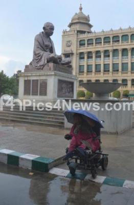 Photo Caption : An handicapped officer at Vidhan Soudha seen covering with umbrella as rains lashed Bengaluru City, in Bengaluru on Tuesday 25th September 2018