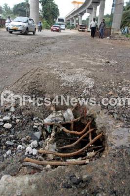 Photo Caption : Pothole road on Rajarajeshwari Arch, Mysore Road, have gone bad to worse after recent rains and have been causing a major threat to the motorists, in Bengaluru on Wednesday 26th September 2018