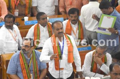 Photo Caption : BJP MPs PC Mohan, Rajiv Chandrashekar, MLCs Lehar Singh, Ravi Kumar and others seen during BBMP Mayor and Deputy Mayor elections at BBMP, in Bengaluru on Friday 28th September 2018