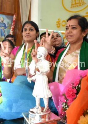 Photo Caption : Newly elected Bengaluru Mayor Gangambika Mallikarjuna and Deputy Mayor Ramila Shankar celebrate their victory during BBMP Mayor and Deputy Mayor elections at BBMP, in Bengaluru on Friday 28th September 2018
