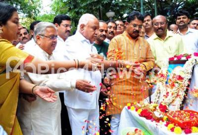 Photo Caption : BJP State President B S Yeddyurappa with BJP Leaders R Ashok Govind Karjol, Tara and others offering floral tribute to the Mahatma Gandhi portrait on the occasion of Gandhi Jayanti and swachh bharat abhiyan program, in Bengaluru on Tuesday 2nd October 2018