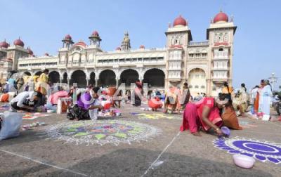 Photo Caption : People participated in the Rangoli competition, as part of the Dasara 2018 celebrations at Mysore Palace, in Mysuru on Thursday 11th October 2018