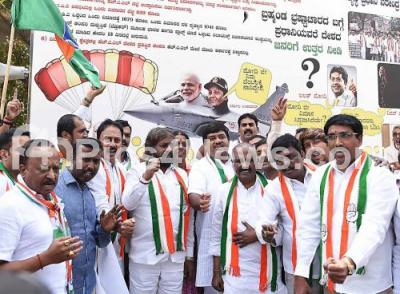 Photo Caption : Congress workers led by Eshwar Khandre, Working KPCC president, staged a protest against the Central Government for the Rafale Deal, the protest was held at Anand Rao Circle, in Bengaluru on Friday 12th October 2018