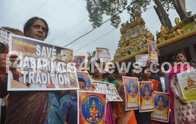 Photo Caption : Large number of Lord Ayyappa Devotees took out a Sarana Gosham Yatra from Vara Siddhi Vinayaka Ayyappa Swamy Temple to Sivanchetty Garden, as part of Save Sabarimala campaign to protest against the Supreme Court order allowing women of all ages to enter the Sabarimala Temple, in Bengaluru on Saturday 13th October 2018