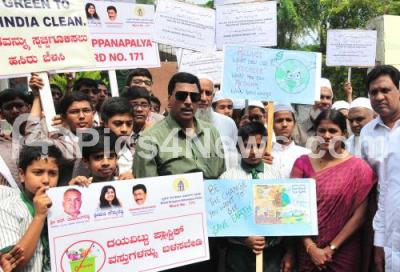 Mayor Nagambike Mallikarjuna with students participated in Go Green awareness campaign and to ban plastic material usage at Gurappanapalya, in Bengaluru on Monday 15th October 2018