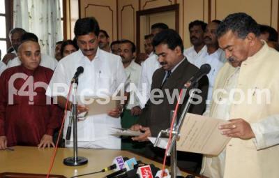 Photo Caption : Veeranna Mattikathi, Council Chairman administrating the oath to S Kalia and GM Madhu as a Legislative Council Members at Vidhana Soudha, in Bangalore on Friday 19th December 2008