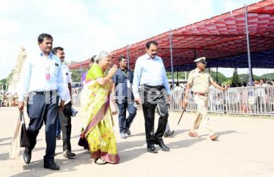 Photo Caption : Sudha Murthy, Chairperson of the Infosys Foundation arriving for the Annual Dasara Jamboo Savari Procession, celebrating Mysuru Dasara Festival 2018, in Mysuru on Friday 19th October 2018