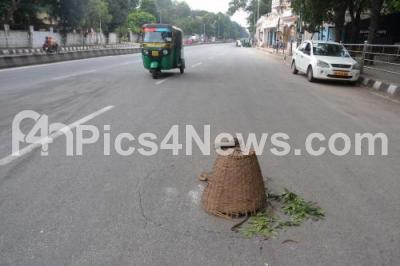 Road caves in at Palace Road, in front of Jnana Jyothi Auditorium and requires immediate attention of the BBMP, posing danger to the motorists, in Bengaluru on Sunday 21st October 2018