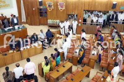 Photo Caption : BBMP Mayor Gangambike Mallkarjuna with BBMP Commissioner Manjunath Prasad and Councilors mourning in memory of Deputy Mayor, Ramila Umashankar, during BBMP council meeting at BBMP, in Bengaluru on Monday 29th October 2018