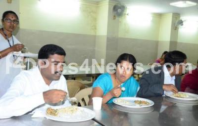 Photo Caption : BBMP Mayor, Nagambike Mallikarjuna and BBMP Commissioner, Manjunath Prasad having Indira canteen food after the BBMP council session, in Bengaluru on Monday 29th October 2018