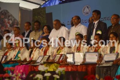 Photo Caption : JDS Supremo HD Devegowda with Minister Bandeppa Kashempur and others presented awards to farmers during the “Krishi Mela 2018 at GKVK, in Bengaluru on Saturday 17th November 2018