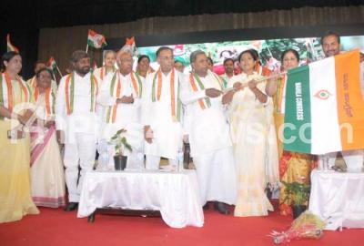Photo Caption : Newly appointed Mahila Congress President Dr Pushpa Amarnath taking charge in the presence of Former CM and Congress Leader Siddaramaiah, KPCC President Dinesh Gundurao, KPCC Working President Eshwar Khandre, Congress Senior Leader Mallikarjuna Kharge, MLA Lakshmi Hebbalkar and others during a program at Ambedkar Bhavan , in Bengaluru on Monday 19th November 2018