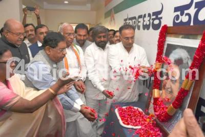 Photo Caption : KPCC President Dinesh Gundu Rao with KPCC Working President Eshwar Khandre, Congress Senior Leader Mallikarjuna Kharge, DCM Dr G Parameshawara and others offering floral tribute to Former PM of India Indira Gandhi portrait on her 101 birth anniversary at KPCC , in Bengaluru on Monday 19th November 2018