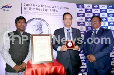 Photo Caption : Vinod Nowal, Deputy MD of JSW Steel showcasing Deming prize with PK Murugan, Executive VP, JSW Steel and Rajashekar Pattanashetty, President, JSW Vijayanagar, during a press conference at Hotel Taj West end , in Bengaluru on Thursday 22nd November 2018