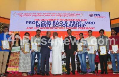 Photo Caption : Minister, GT Devegowda with MK Shankarlinge Gowda, Chairman, Karnataka. Electricity Regulatory Commission, Dr MR Doreswamy, Former MLC seen presenting scholarships during the PES University foundation day at PES College, in Bengaluru on Saturday 24th November 2018