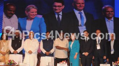 Photo Caption : CM HD Kumarswamy seen with Ministers KJ George, RV Deshpande, Priyank Kharge, Kate Jones, Minister for Innovation and Tourism Industry Development, Queensland Parliament, Australia, Kiran Mazumdar Shaw, CMD BIOCON, Kris Gopalakrishnan, Infosys Co Founder and others seen at the inauguration of Bengaluru Tech Summit at Palace Grounds, organised by Government of Karnataka, in Bengaluru on Thursday 29th November 2018