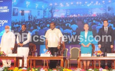 Photo Caption : CM HD Kumarswamy with Ministers KJ George, RV Deshpande, Kate Jones, Minister for Innovation and Tourism Industry Development, Queensland Parliament, Australia and others seen at the inauguration of Bengaluru Tech Summit at Palace Grounds, organised by Government of Karnataka, in Bengaluru on Thursday 29th November 2018