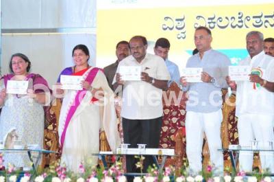 Photo Caption : CM HD Kumarswamy releasing braille calendar 2019 during World Disability Day program at Freedom Park, also seen are MLAs Dinesh Gundu rao, S T Somashekar, Minister Jayamala and others, in Bengaluru on Monday 3rd December 2018