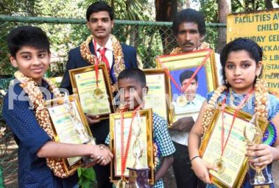 Photo Caption : Hoysala and Keladi Channama Shourya awardees Arati Kirana Shet, SN Mourya, late Hemanth SM , Nikila Dayanand and Sujaya during Children Day celebration program, organised by Women and Children Development Department at Bal Bhavan, in Bengaluru on Wednesday 5th December 2018