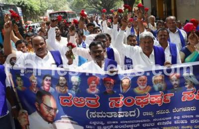 Event Description : Members of Dalit Sangharsha Samithi participated in a rally from Bannappa Park to Ambedkar Statue at Vidhan Soudha, on the occasion of death anniversary of Dr BR Ambedkar, in Bengaluru on Thursday 6th December 2018