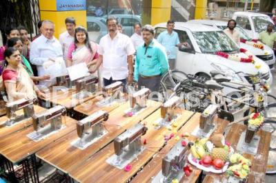 Photo Caption : MLAs Ramalinga Reddy, Sowmya Reddy and others distributed sewing machine, bicycle, car, auto rickshaw, two wheeler, Iron box to the beneficiaries under BBMP scheme at Jayanagar, in Bengaluru on Sunday 9th December 2018