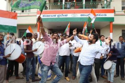 Photo Caption : Congress Leaders and workers celebrate the victory in Assembly elections in Madhya Pradesh, Rajasthan and Chhattisgarh states, the celebrations were held in front of KPCC Office, in Bengaluru on Tuesday 11th December 2018