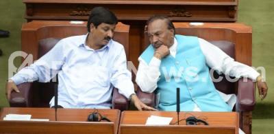 Photo Caption : Minister Ramesh Jarkiholi seen with BJP Leader KS Eshwarappa during Assembly Session at Suvarna Soudha in Belagavi, on Tuesday 11th December 2018